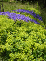 Der Weiche Frauenmantel ist eine alt bewährte Gartenstaude mit vielerlei Vorteilen. Seine hübschen Blätter wirken besonders nach Regen oder in den frühen Morgenstunden, wenn sich der Morgentau in kleinen Wasserperlen darauf sammelt, denn das Blatt hat einen Lotuseffekt. Die im Sommer erscheinenden gelblichgrünen Blüten werden auch gerne für den Schnitt verwendet, sie harmonieren mit anderen Sommerblühern wie Storchenschnabel besonders gut. Auch in der Frauenheilkunde ist der Frauenmantel beliebt und wird gerne für Tee verwendet. Bienen und andere Insekten erfreuen sich nicht nur an der Blüte, sondern auch an den Wassertropfen, die das Blatt für sie sammelt. Alchemilla mollis ist bestens winterhart,es zieht sich im späten Herbst in den Boden zurück und überwintert dort, im Frühjahr treibt es wieder kräftig durch. Nach der Blüte ist ein Rückschnitt der Staude empfehlenswert, zum einen treibt sie dann wieder kräftig und dicht durch, zum Anderen kann man so das starke Versamen verhindern. Wer die Pflanze vermehren möchte, kann sie im Herbst teilen, dafür wird sie mit einem scharfen Messer geteilt und die einzelnen Stücke wieder neu eingepflanzt. Frauenmantel gedeiht sowohl in der Sonne als auch im Schatten und liebt frische-feuchte, nährstoffreiche, humose, durchlässige Böden, es kommt aber auch mit vorübergehender Trockenheit zurecht.