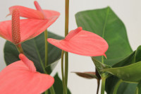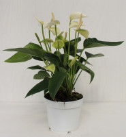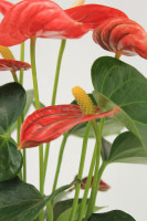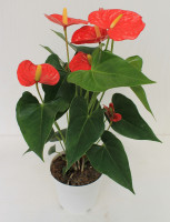 Die Großlaubige Flamingoblume hat hübsche, große, herzförmige Blätter und bezaubert mit ihren auffälligen Hochblättern (Spatha), diese werden fälschlicherweise gerne für die Blüte der Anthurie gehalten, in Wirklichkeit ist die Blüte aber der je nach Sorte gelb, orange oder rot gefärbte Kolben. Anthurien blühen meist im Juni, man bekommt sie aber fast ganzjährig blühend angeboten. Die Spatha ist je nach Sorte weiß, rosa, pink oder rot. Anthurien sind recht pflegeleicht, sie mögen einen hellen Standort im Zimmer ohne direkte Sonne, die Erde sollte gleichmäßig feucht, locker und durchlässig sein. Beispielpflanze auf dem letzten Bild im 14 cm Topf.