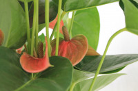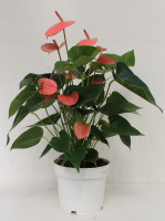 Die Großlaubige Flamingoblume hat hübsche, große, herzförmige Blätter und bezaubert mit ihren auffälligen Hochblättern (Spatha), diese werden fälschlicherweise gerne für die Blüte der Anthurie gehalten, in Wirklichkeit ist die Blüte aber der je nach Sorte gelb, orange oder rot gefärbte Kolben. Anthurien blühen meist im Juni, man bekommt sie aber fast ganzjährig blühend angeboten. Die Spatha ist je nach Sorte weiß, rosa, pink oder rot. Anthurien sind recht pflegeleicht, sie mögen einen hellen Standort im Zimmer ohne direkte Sonne, die Erde sollte gleichmäßig feucht, locker und durchlässig sein. Beispielpflanze auf dem letzten Bild im 17 cm Topf.