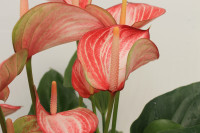 Die Großlaubige Flamingoblume 'Livium' kommt mit ihrem gestreiften Hochbatt in Sonderfarbe daher. Anthuriaum andraeanum hat hübsche, große, herzförmige Blätter und bezaubert mit ihren auffälligen Hochblättern (Spatha), diese werden fälschlicherweise gerne für die Blüte der Anthurie gehalten, in Wirklichkeit ist die Blüte aber der je nach Sorte gelb, orange oder rot gefärbte Kolben. Anthurien blühen meist im Juni, man bekommt sie aber fast ganzjährig blühend angeboten. Anthurien sind recht pflegeleicht, sie mögen einen hellen Standort im Zimmer ohne direkte Sonne, die Erde sollte gleichmäßig feucht, locker und durchlässig sein. Diese schöne Sorte haben wir nicht immer vorrätig, frage sie aber gerne bei uns an.